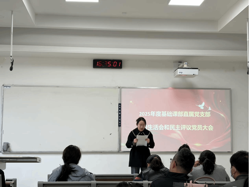 为深入学习贯彻习近平新时代中国特色社会主义思想,严格落实基层党组织建设要求,切实增强党支部凝聚力、战斗力与向心力,2026年3月11日16:20,基础课部直属党支部在教学楼110教室召开2025年度基层党组织组织生活会和民主评议会。思政部、外语部、体育部全体党员参会,会议由党支部书记魏晓晓主持。