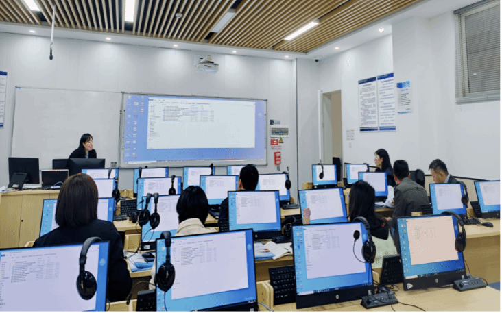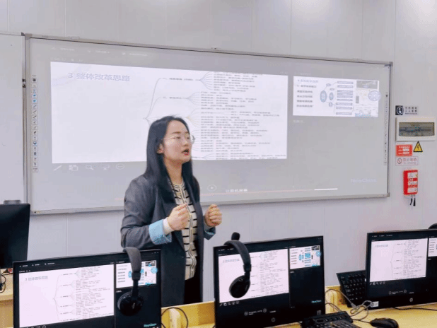各负责人分别围绕项目建设进展、阶段性成果、存在问题及下一步计划进行了详细汇报。实验教学示范中心项目负责人孙瑜从中心定位、实验教学创新与改革、实验设备配置、师资队伍培养等方面,全面展示了中期建设情况。该中心现已初步构建起契合大学英语听说教学特色的实验教学体系,初步形成线上线下融合教学模式。团队老师现场为验收组成员演示如何使用FIF口语教学平台,实现线上线下融合实验教学,获得了现场人员的肯定。