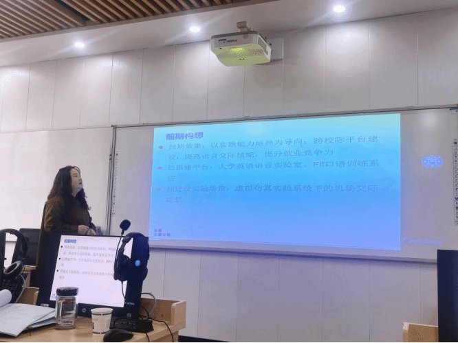 虚拟仿真实验中心项目负责人赵蓓对项目从前期构想、中期落实到未来计划进行了全面展示与说明。此外,着重演示了预设搭建的实验场景——虚拟仿真实验体系下的机场交际场景,介绍了该项目在突破时空限制、构建高沉浸交互教学场景、提升学生语言应用实践能力等方面的进展。目前已完成核心仿真实验模块的开发,力求弥补传统实践教学的短板,践行“能实不虚、虚实结合”的建设原则。
